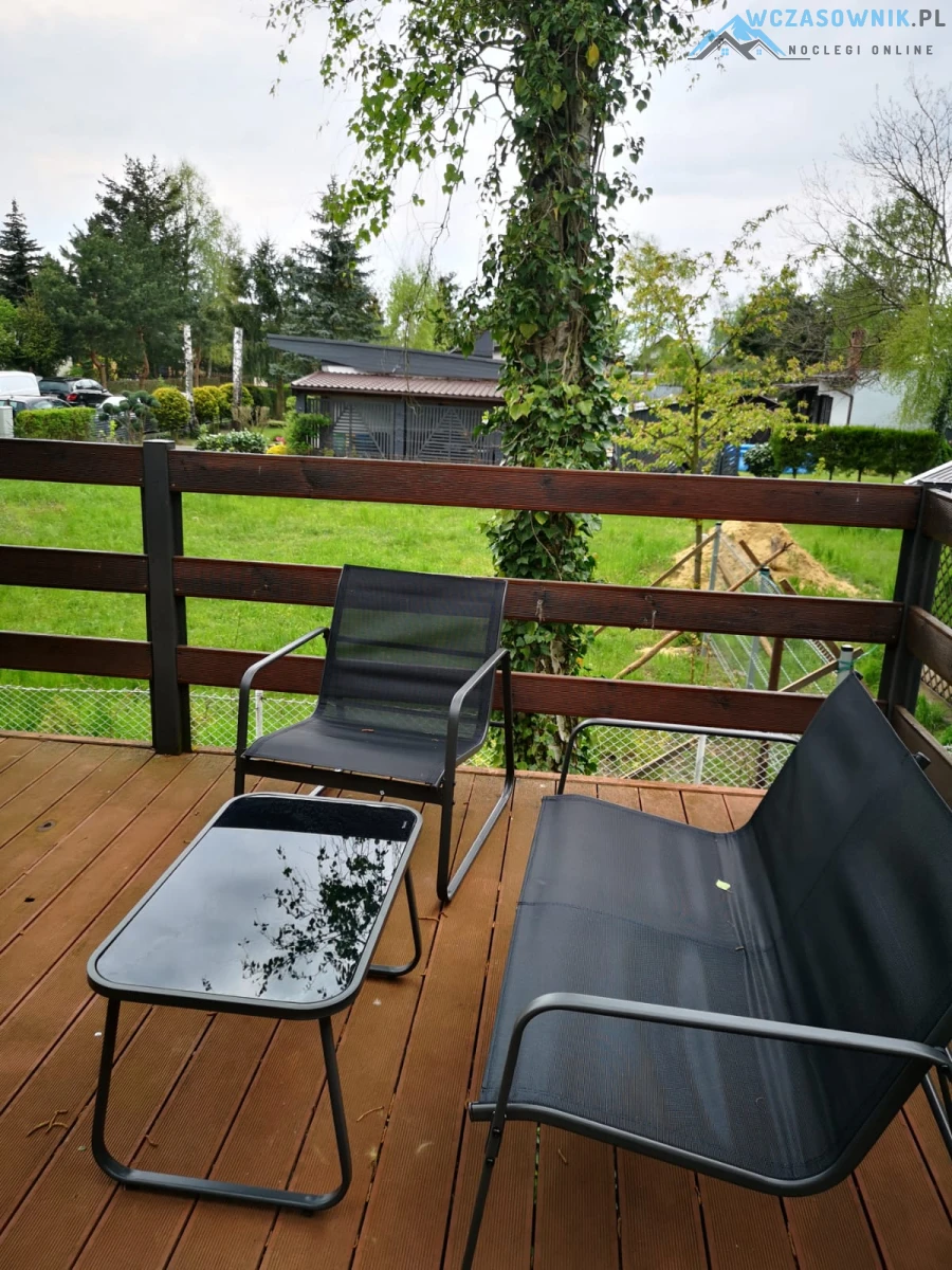 Na zadaszonym tarasie znajduje się duży stół z krzesłami dla wygodnego biesiadowania. Na tarasie otwartym można się zrelaksować korzystając z komfortowych mebli ogrodowych.
