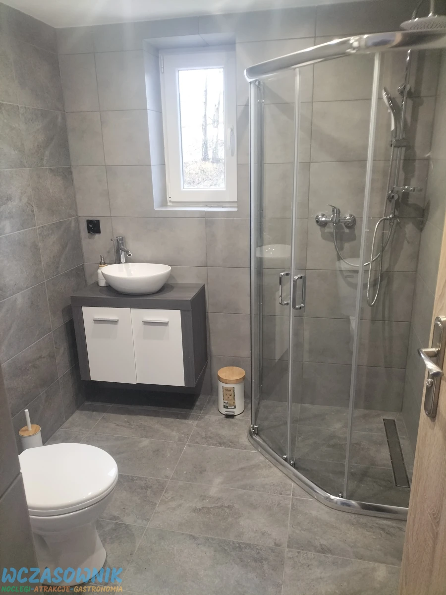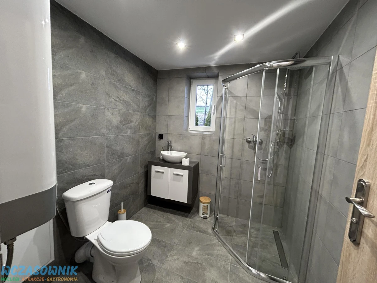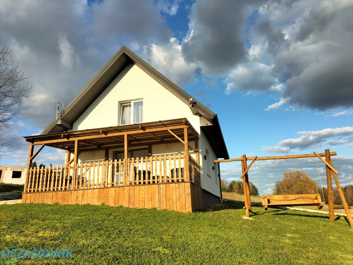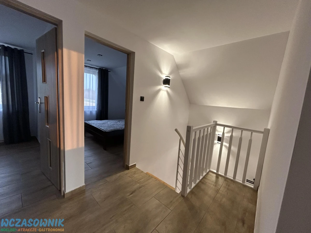 Budynek posiada przestronny salon, polaczony z kuchnia, dwie lazienki. Na parterze toaleta, prysznic i umywalka. Na pietrze toaleta i umywalka oraz trzy sypialnie w kazdej jedno lozko malzenskie i jedna sypialnia dwa lozka malzenskie. Domek posiada ogrzewanie podlogowe, duzy taras z wypoczynkiem, garaz na jeden samochod.